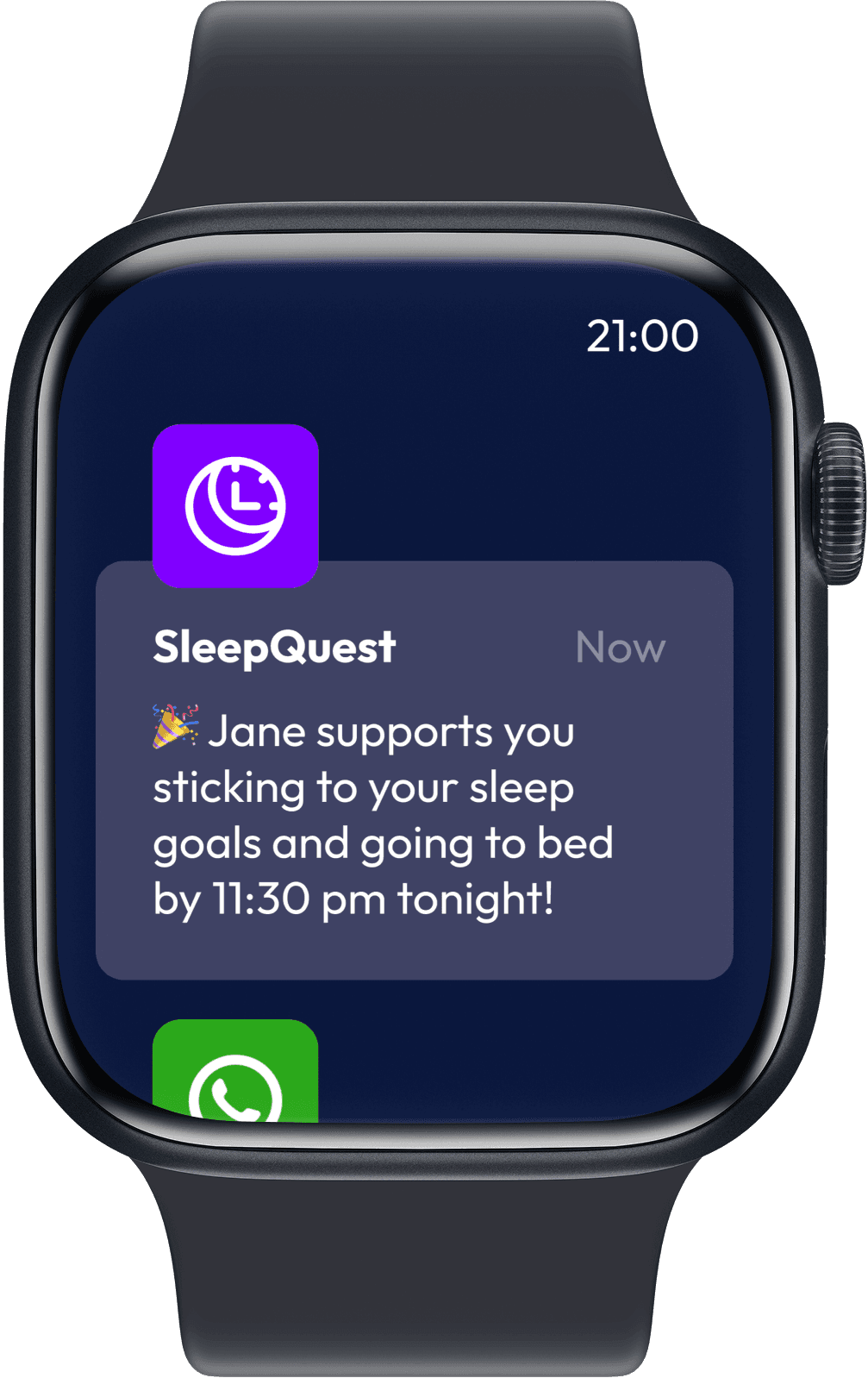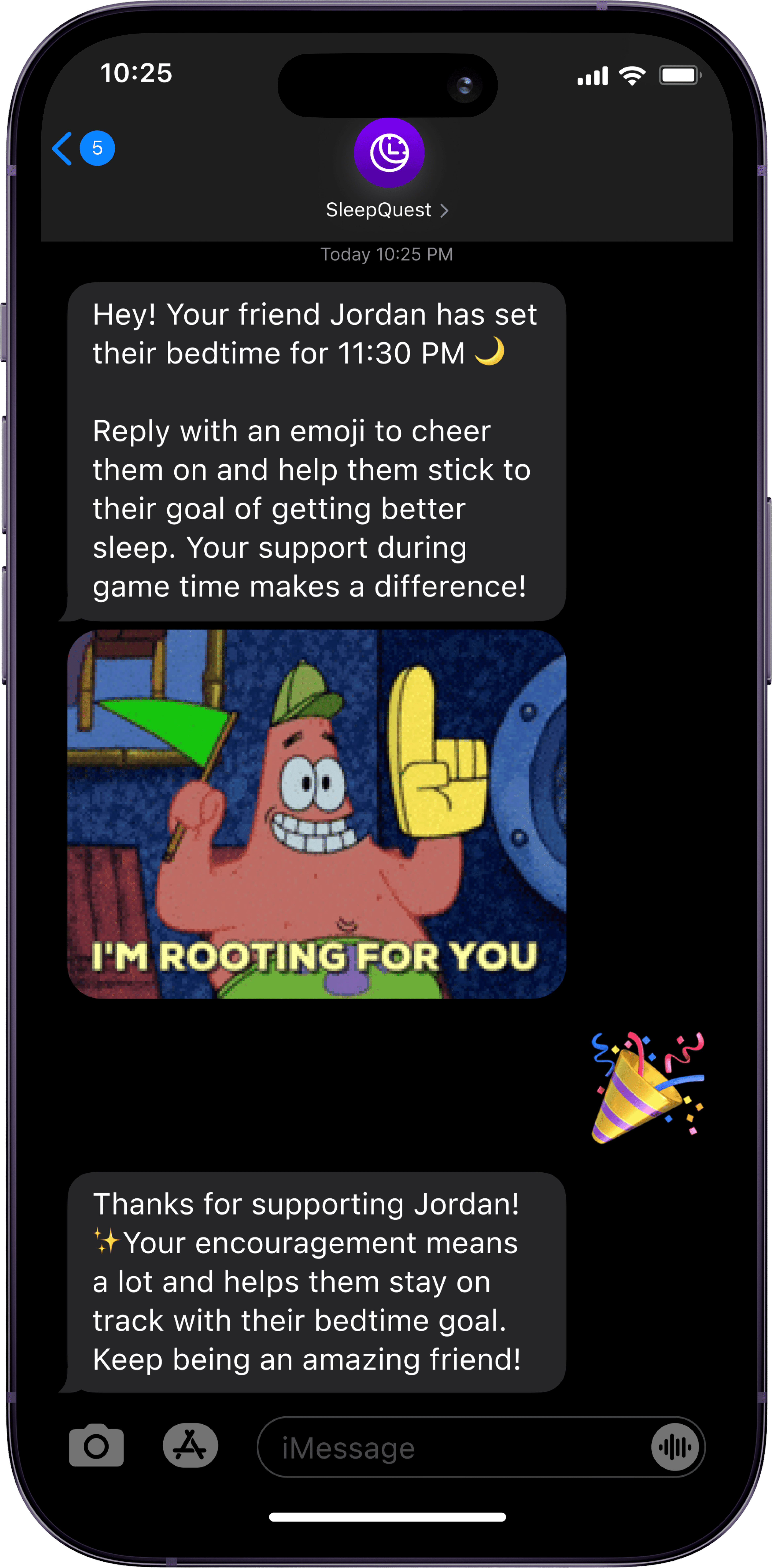 As bedtime approaches, friends receive a text message prompt and can respond with emoji reactions. These responses trigger push notifications for the user, providing simple and timely reinforcement that helps them follow through on their sleep commitments.