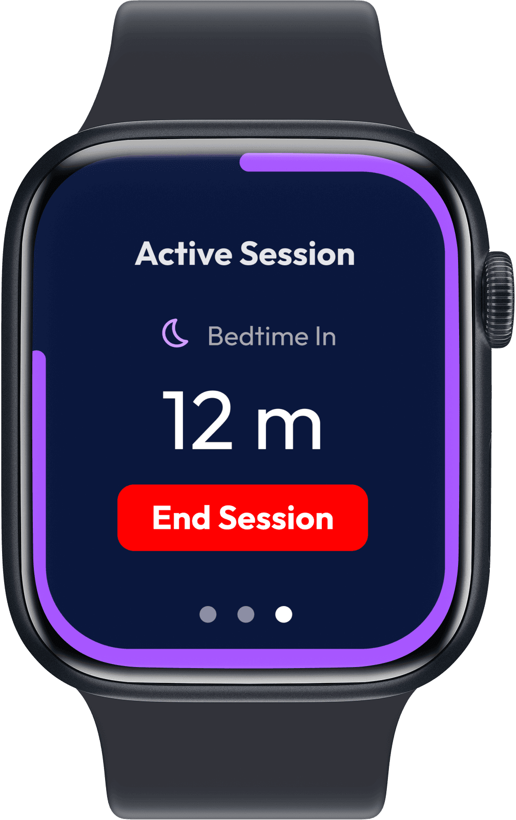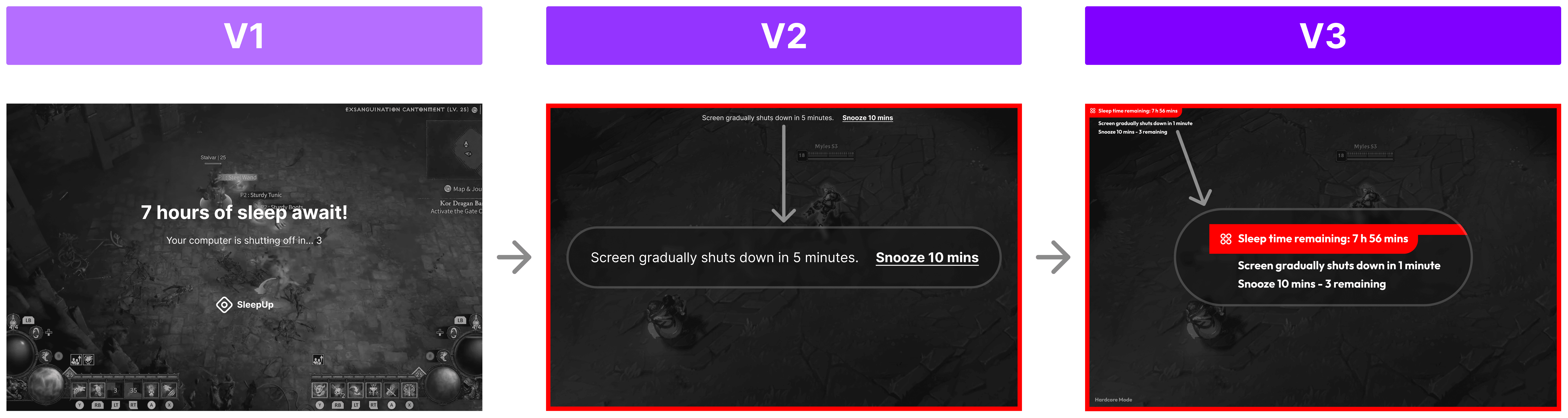 When the user approaches, a countdown appears as a perimeter ring around the screen of their gaming device. Initially, it displayed only the countdown time, but we updated it to include text explaining the purpose of the countdown. We also added a notification that appears briefly when the user receives support from external contacts who encourage their bedtime.