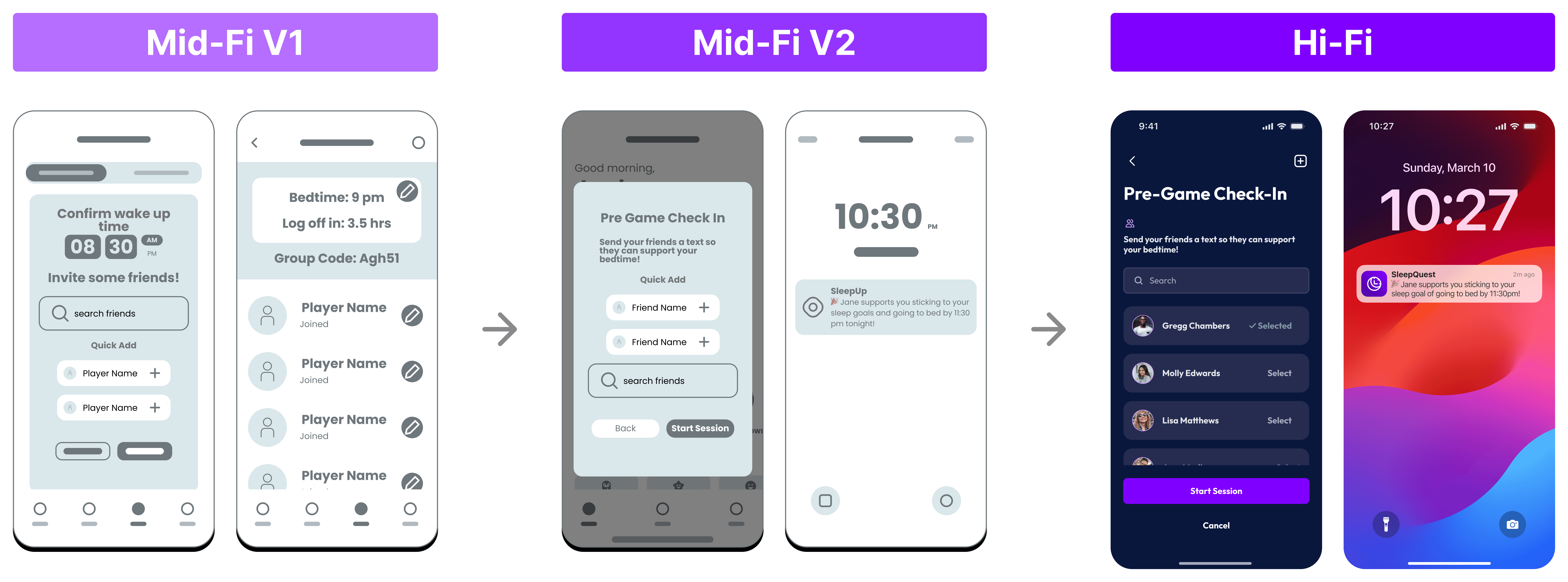 After sketching preliminary low-fidelity designs, we created mid-fidelity wireframes to develop key user flows, build our vision for SleepQuest, and conduct user testing. During this process, I took ownership of the homepage, social support intervention, scheduling, and profile sections of the mobile app.