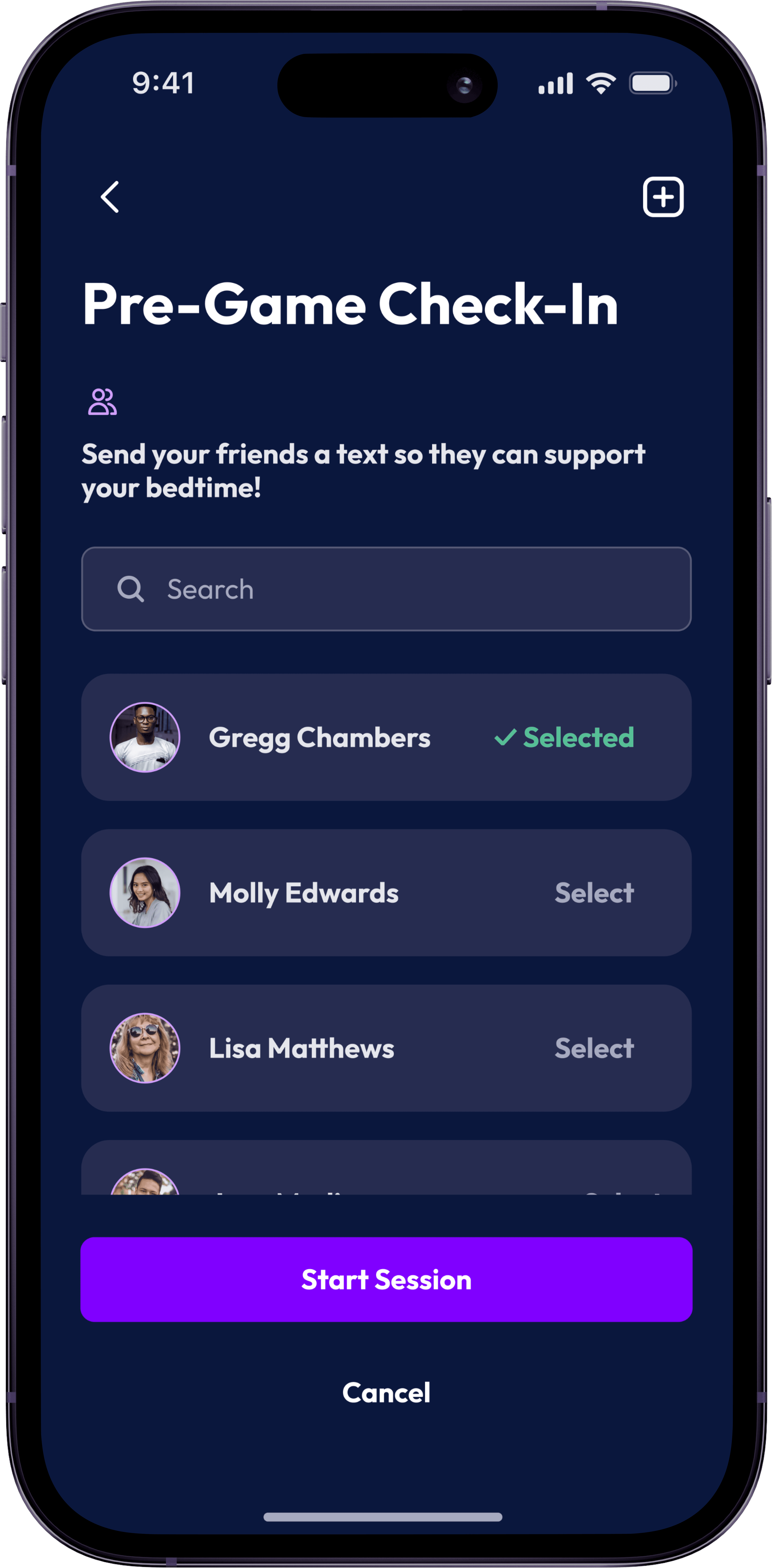 The social support system enhances users’ ability to initiate and sustain behavior change by enabling them to receive encouragement from their network. Users can add contacts and invite friends to support their bedtime goals during a gaming session.