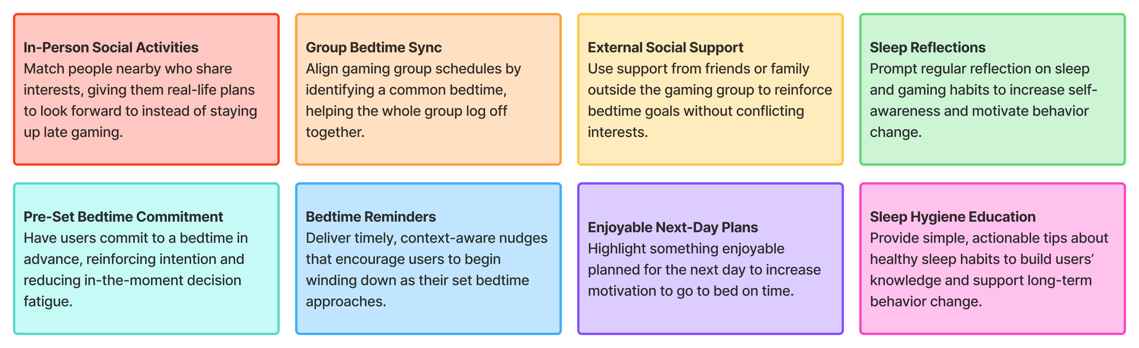 In a collaborative brainstorming session, we explored a range of intervention ideas focused on helping gamers build healthier sleep habits. Below is an overview of our main brainstorming results.