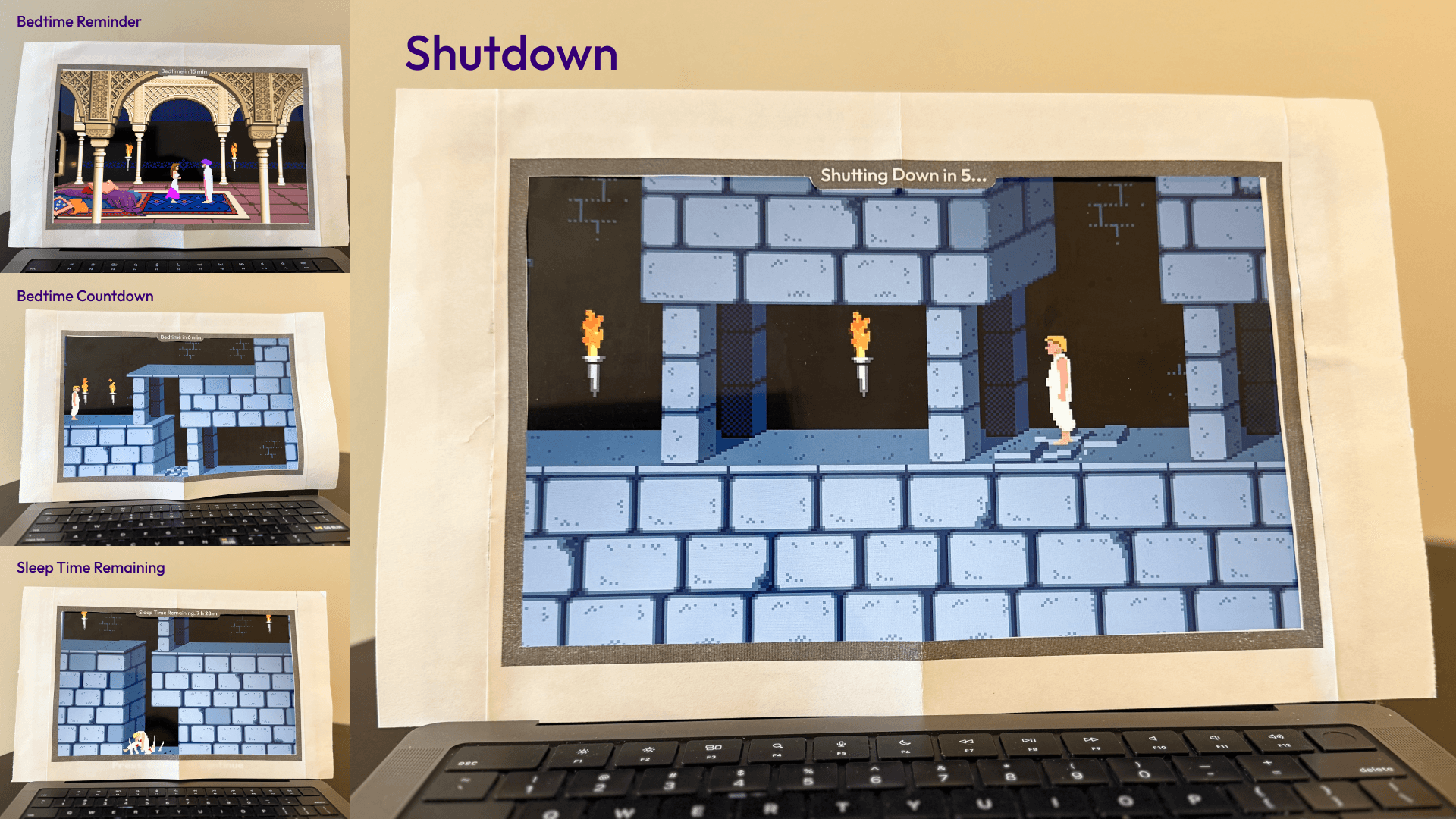 SleepQuest activates a visual screen barrier on the console or laptop when bedtime is near or has passed, based on a support level selected by the user. This barrier clearly displays how much sleep time remains and escalates based on the chosen mode: